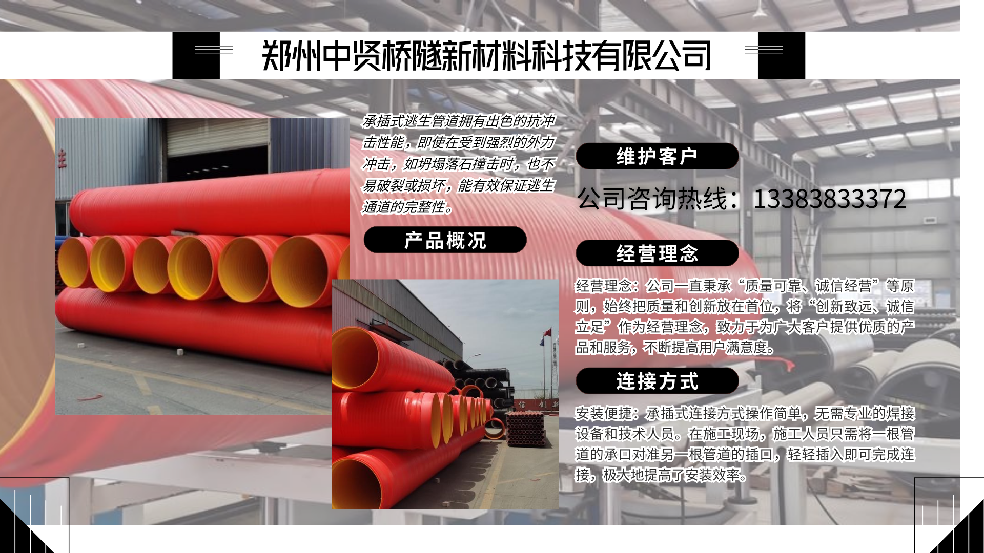 在隧道施工安全問題上,不能有絲毫的馬虎和懈怠。選擇鄭州中賢橋隧公司的承插式隧道逃生管道,就是為隧道施工安全增添一份可靠的保障,為施工人員的生命安全筑起一道堅固的防線。期待與您攜手合作,共同打造安全、高效的隧道施工環(huán)境。